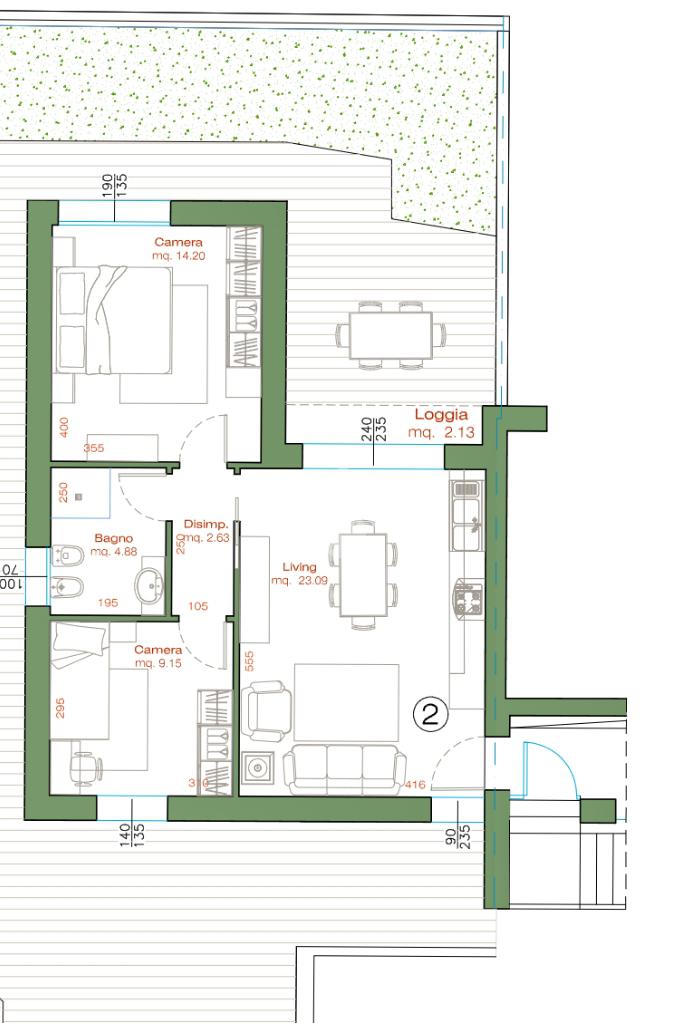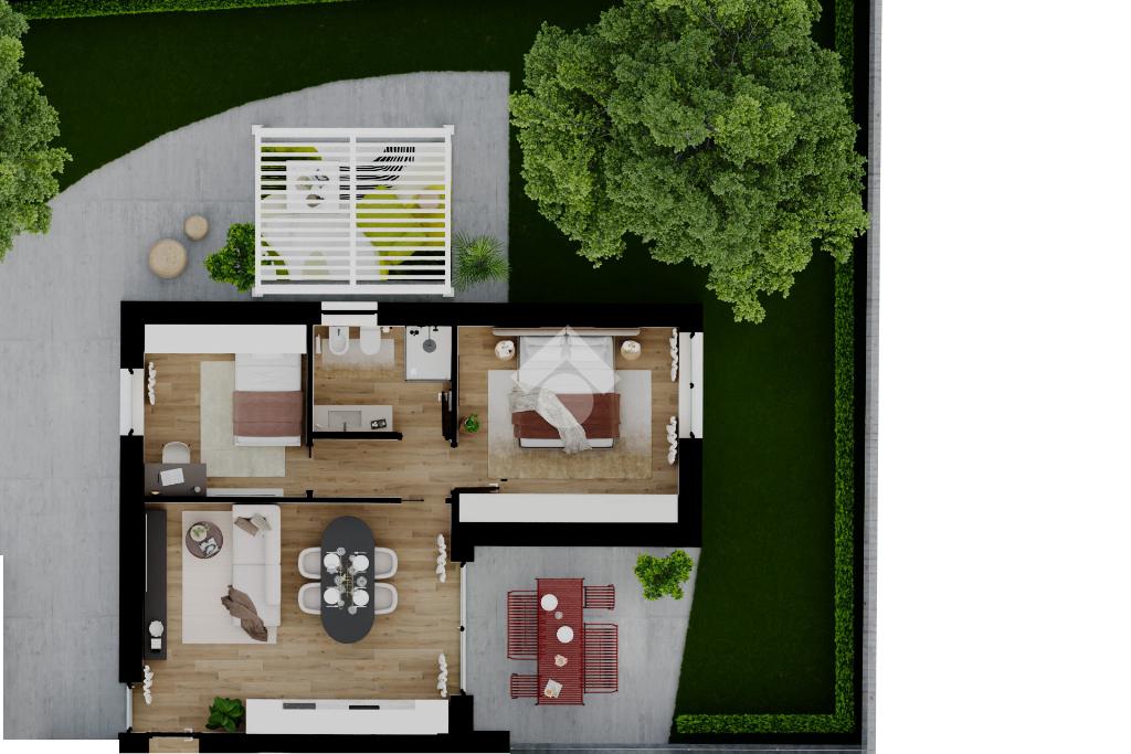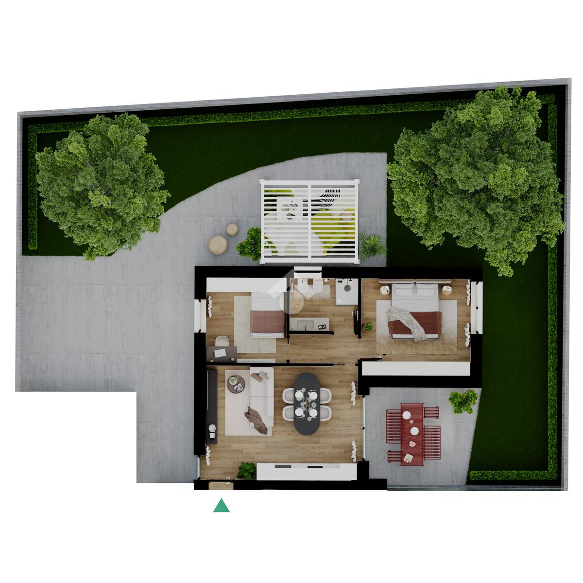 Trilocale di nuova costruzione in classe energetica A4 di 90 mq commerciali situato al piano terra con ampio giardino. L’accesso è diretto sulla zona living open space, composta da zona dining e zona soggiorno. Da qui si accede da una parte al giardino tramite una comoda porta finestra, dall’altra al meraviglioso patio, perfetto per momenti di convivialità e relax.