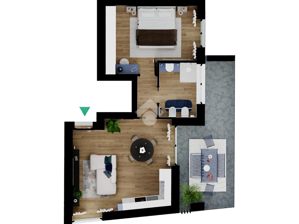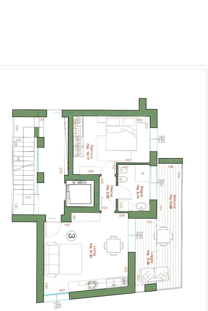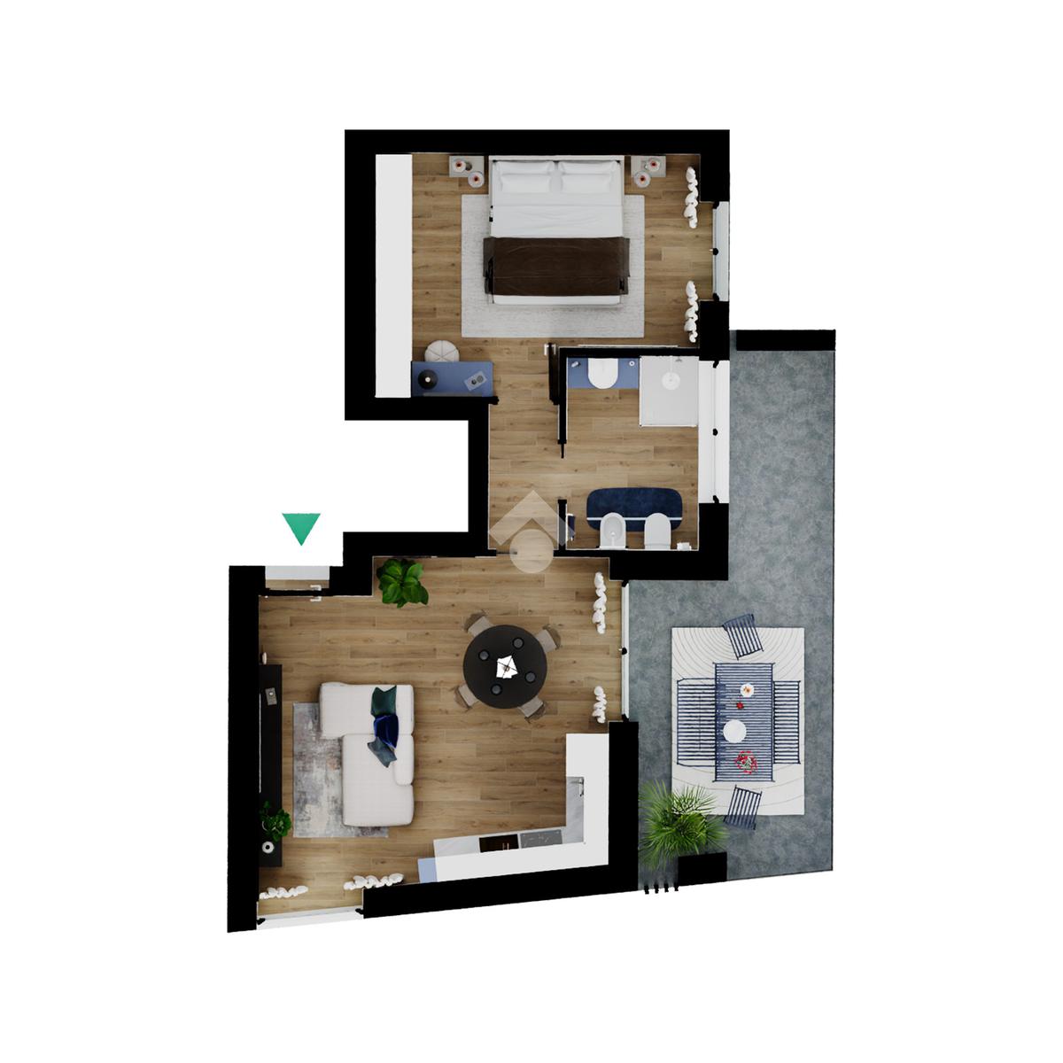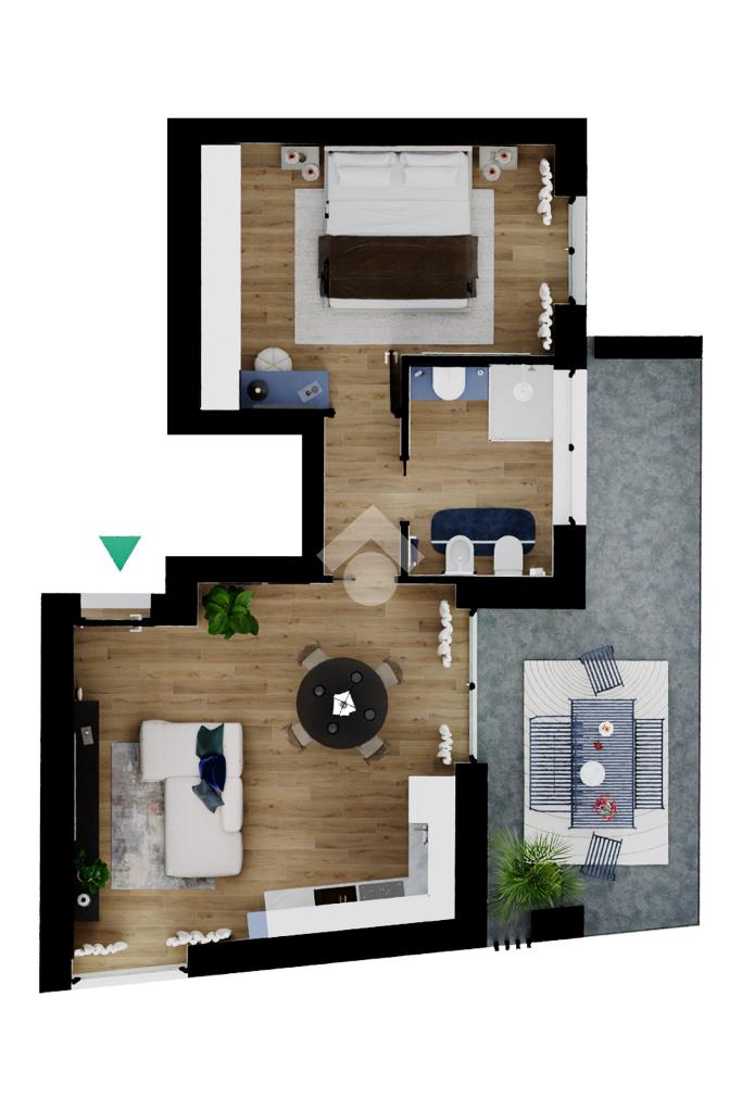 Bilocale di nuova costruzione in classe energetica A4 di 67 mq commerciali situato al piano uno con ampio balcone abitabile. Si accede all’appartamento nella zona soggiorno/open space con cucina. Un’ampia porta finestra permette di accedere al meraviglioso balcone.