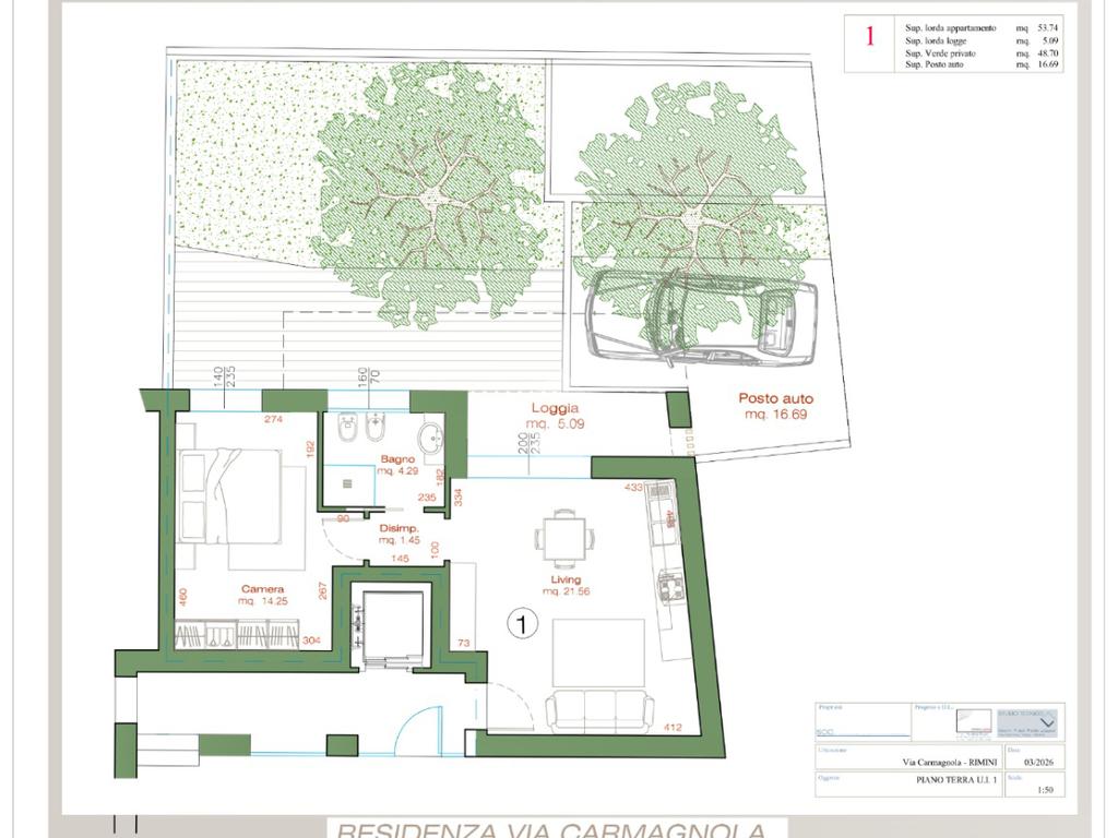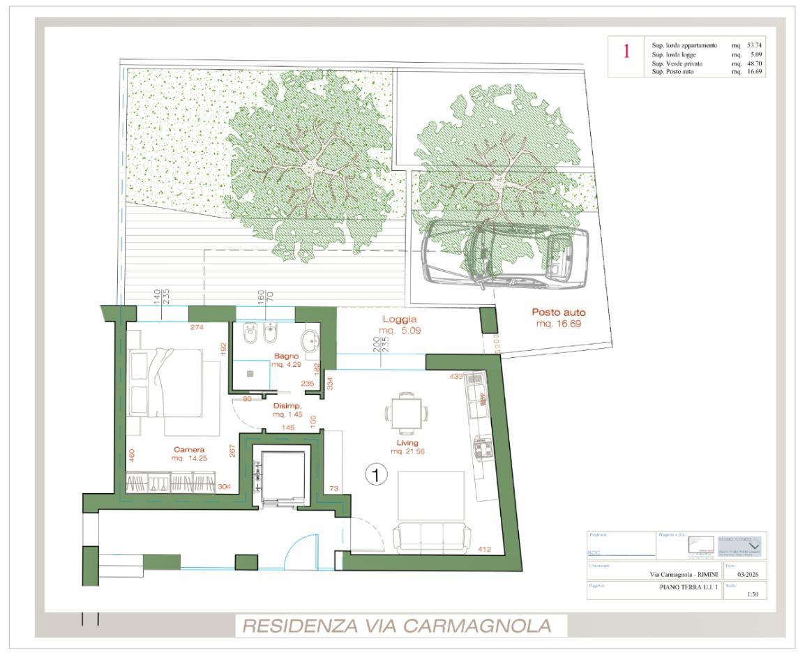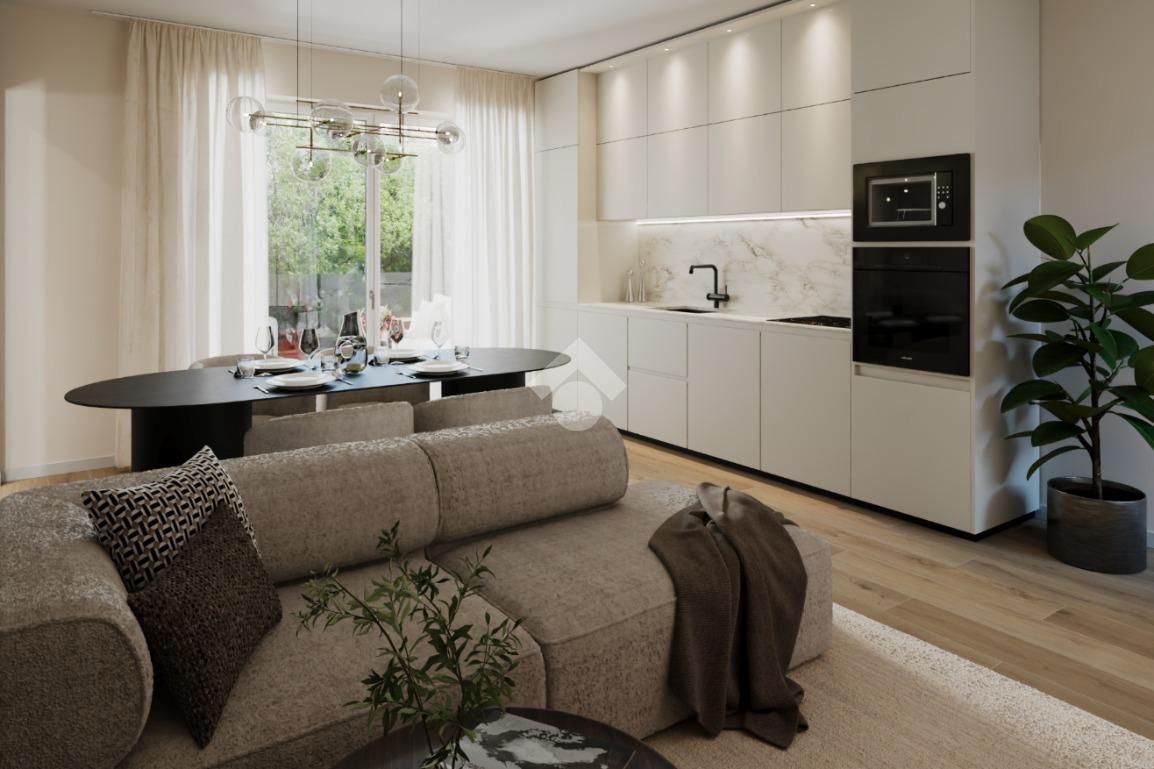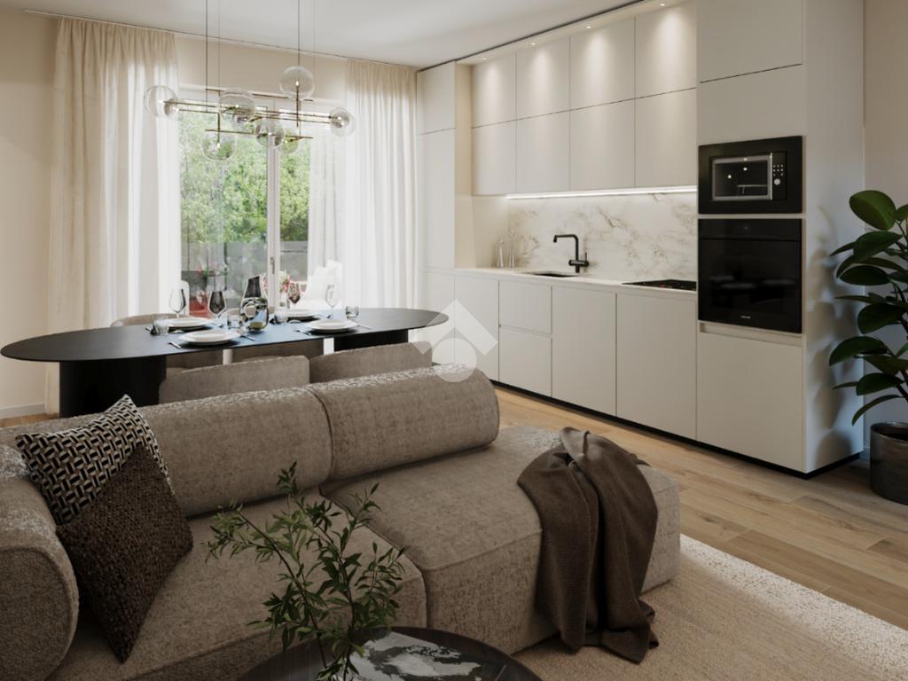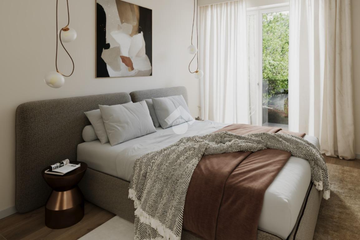 Bilocale di nuova costruzione in classe energetica A4 di circa 65 mq commerciali situato al piano terra con meraviglioso giardino. Si accede all’appartamento nella zona soggiorno/open space con cucina. Un’ampia porta finestra permette di accedere al giardino privato.